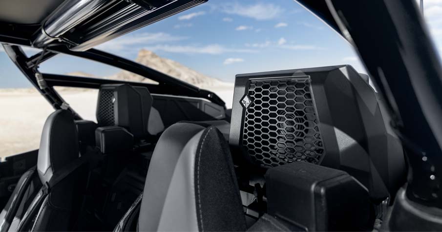 Sistema de audio Rockford Fosgate Stage 4 integrado y ajustado de fábrica con unidad fuente RIDE COMMAND. Incluye (1) amplificador digital de 1500 W y 8 canales, (2) tweeters de 1« y 100 W, (2) altavoces delanteros de 6,5» y 100 W, (2) altavoces traseros coaxiales de 6,5« y 100 W, y (1) subwoofer de 10».