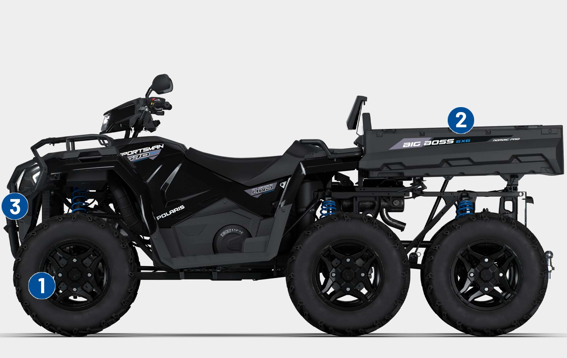 La nueva generación del Sportsman 6x6 570 tiene un nuevo y audaz diseño, un chasis reforzado y mejores capacidades 6x6 para una marcha más suave y un confort superior.